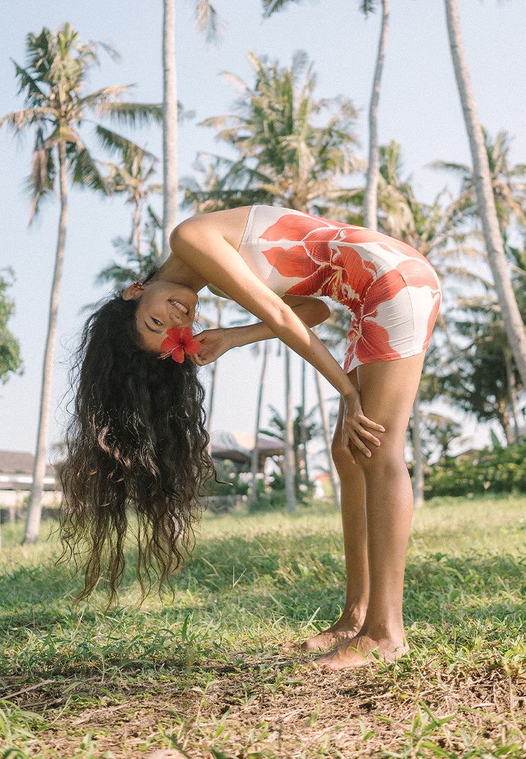 The dress is a strapless design adorned with a floral pattern, perfect for a tropical or summery setting. Its lively colors and lightweight fabric enhance the breezy outdoor vibe.