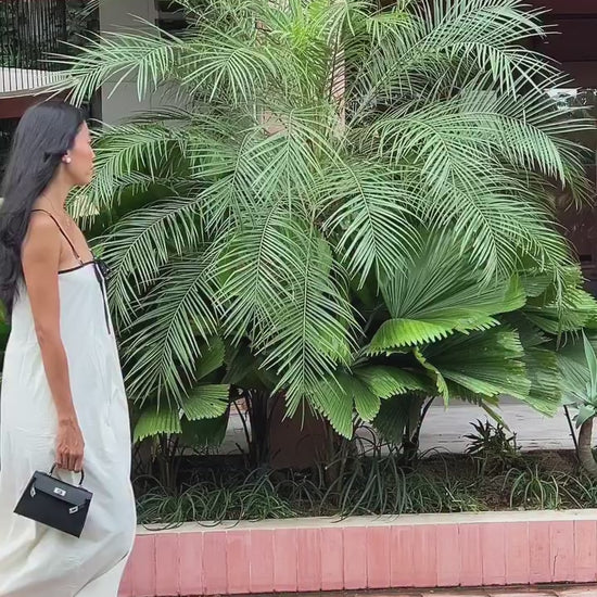 Square neckline, spaghetti strap adjustable, sleeveless, a line long dress, tie ribbon at the back, linen material, breathable and slip on.